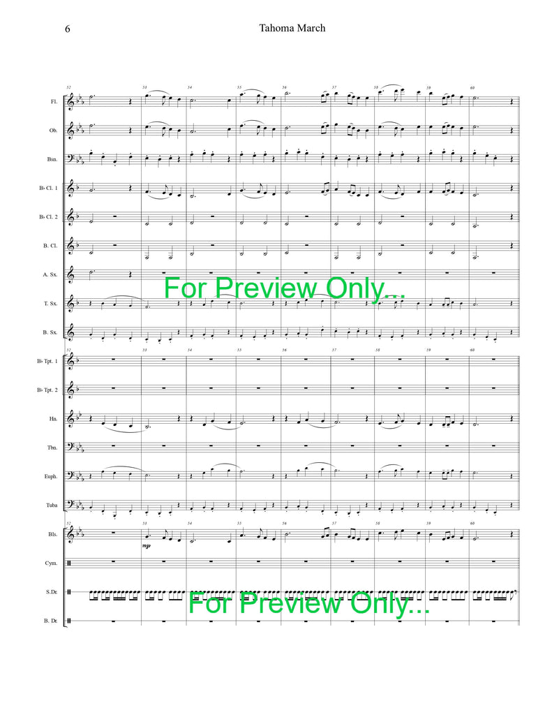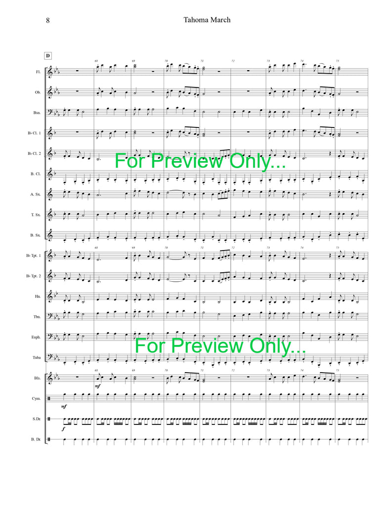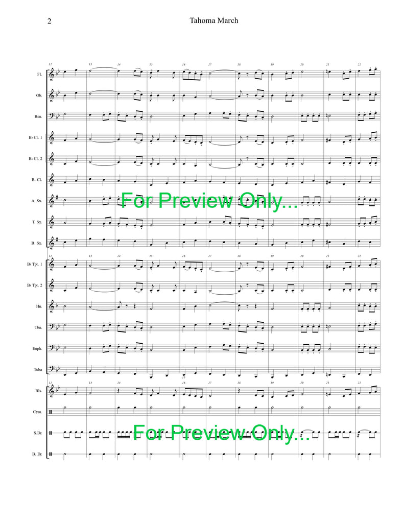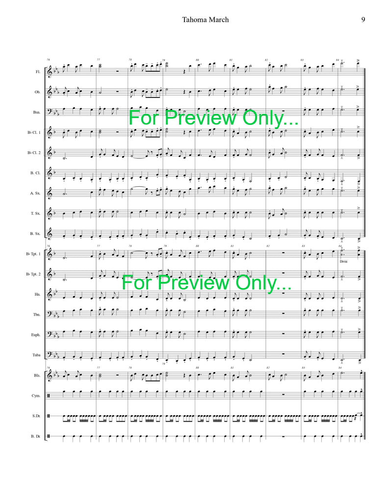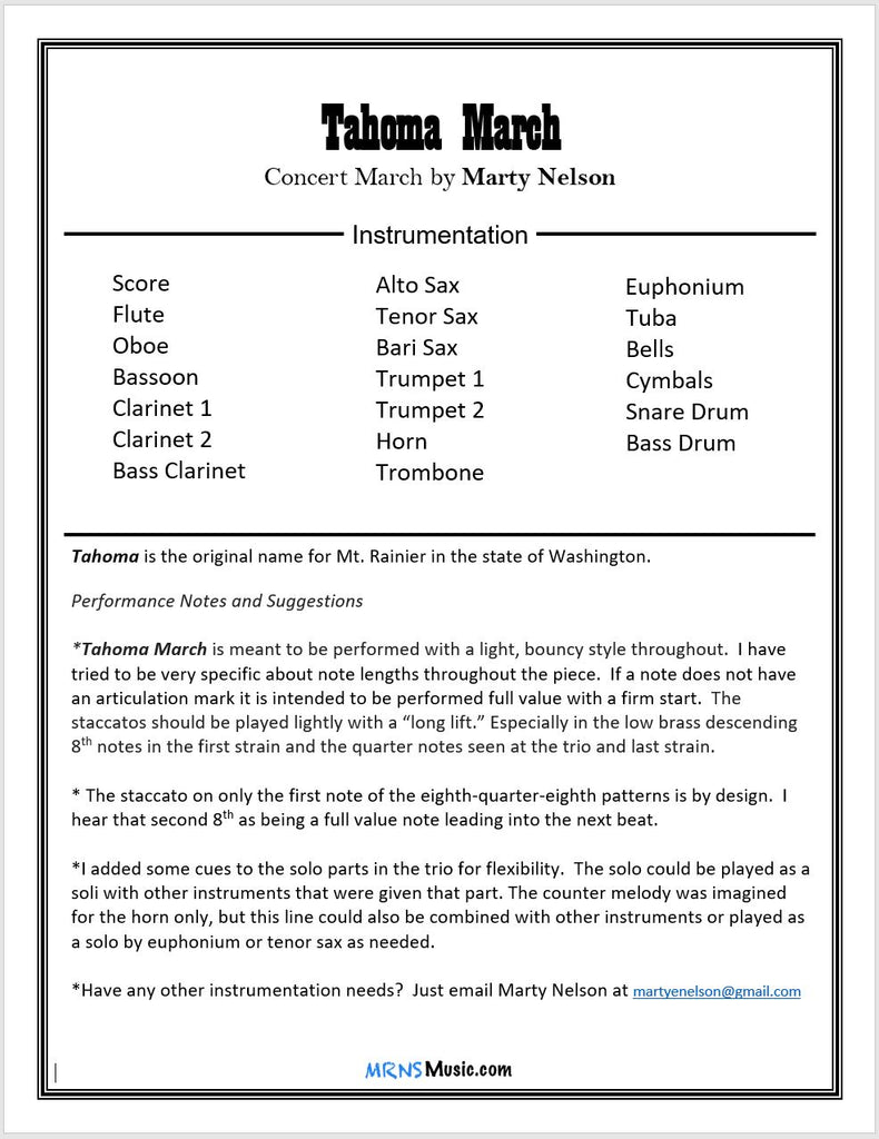 * Tahoma March is meant to be performed with a light, bouncy style throughout. I have tried to be very specific about note lengths throughout the piece. If a note does not have an articulation mark it is intended to be performed full value with a firm start. The staccatos should be played lightly with a “long lift.” Especially in the low brass descending 8th notes in the first strain and the quarter notes seen at the trio and last strain.