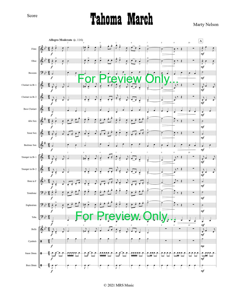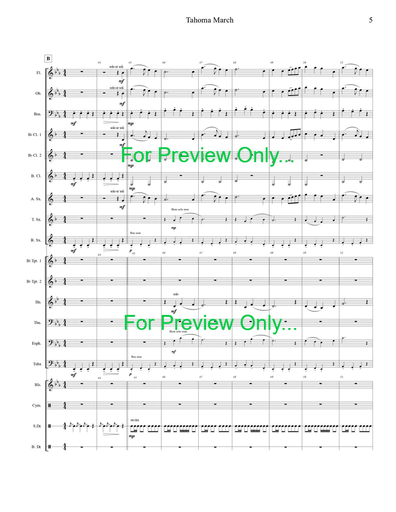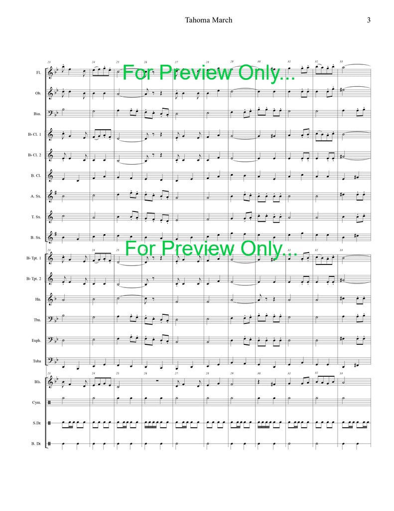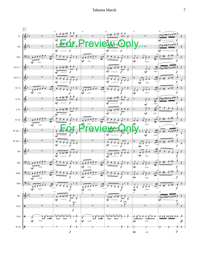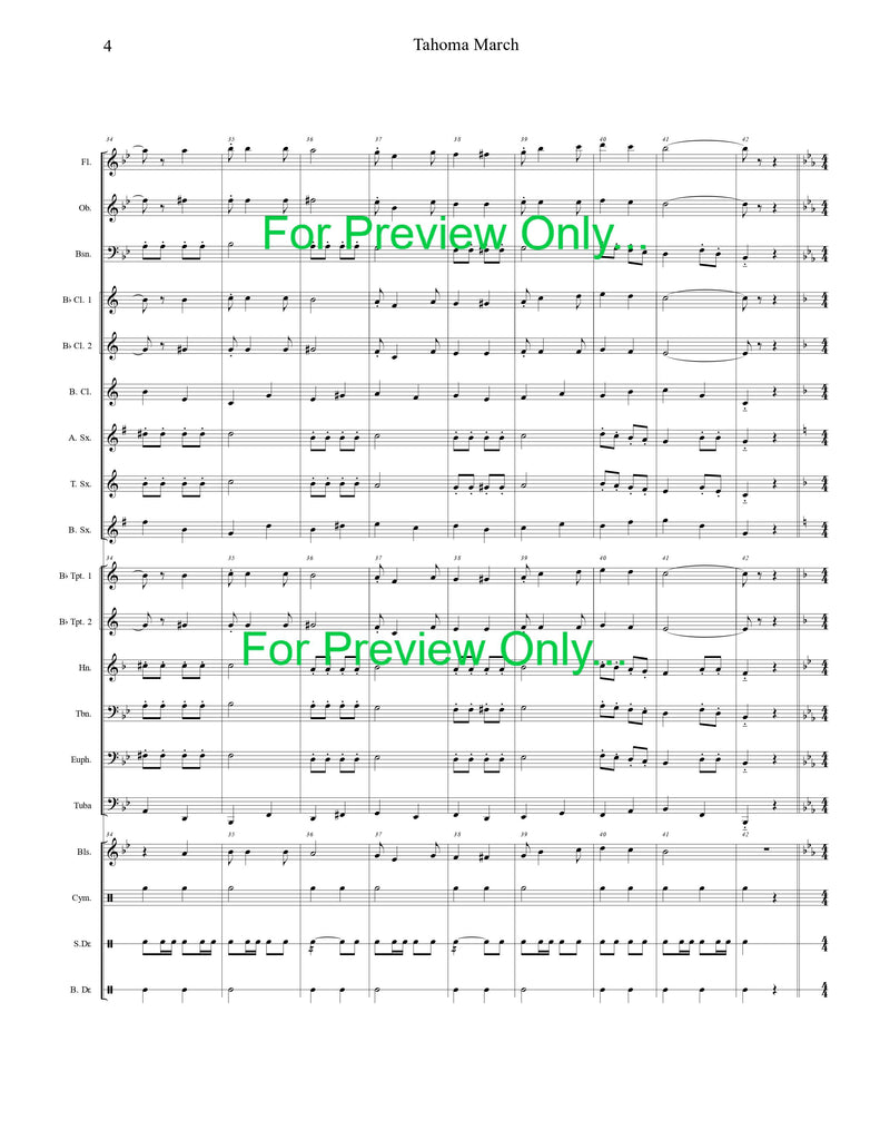* Tahoma March is meant to be performed with a light, bouncy style throughout. I have tried to be very specific about note lengths throughout the piece. If a note does not have an articulation mark it is intended to be performed full value with a firm start. The staccatos should be played lightly with a “long lift.” Especially in the low brass descending 8th notes in the first strain and the quarter notes seen at the trio and last strain.