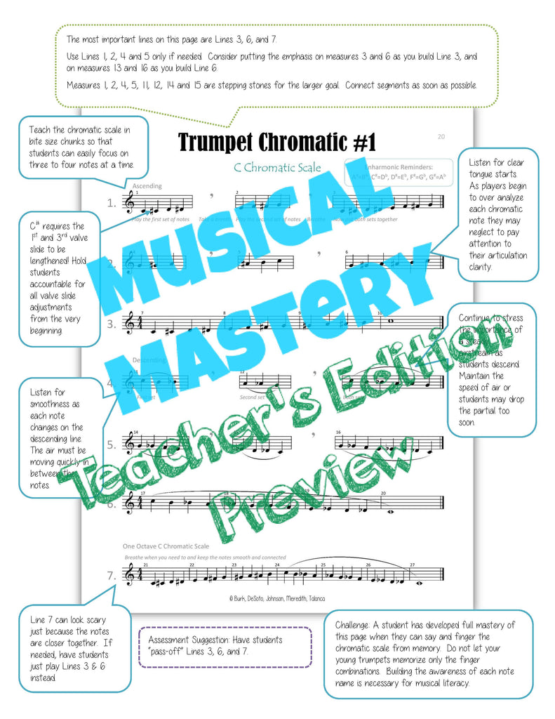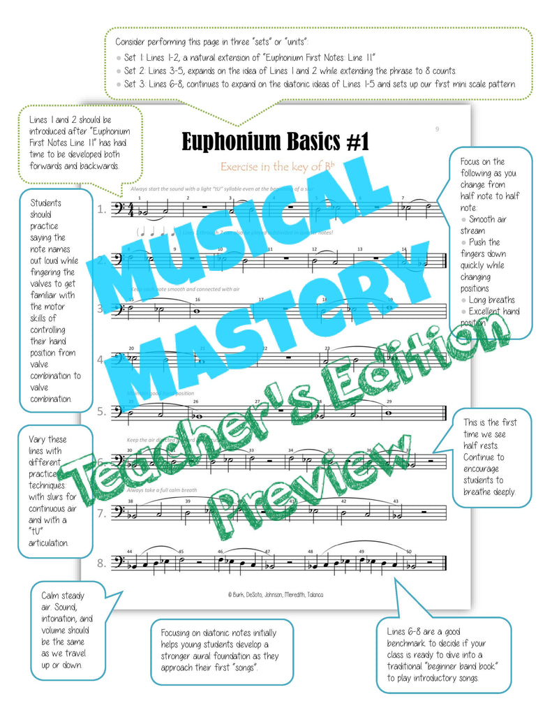 The purpose of this book is to fill in the gaps left by most band method books used in instrumental music classes. This is not intended to be a “stand alone” method, but rather the bulk of what needs to be covered in a beginner band class for students to function independently on instrument specific repertoire and in a performing band situation. The band method book is then used as a supplement to this book, which is more detailed and offers a systematic approach to teaching embouchure, instrument range, alternate fingerings and the correct use of those fingerings, rhythmic reading, and scales. This method of teaching is more chromatic than diatonic based and allows for more in depth study of the tendencies of the individual instruments, embouchure for various ranges, and specific fingering uses.