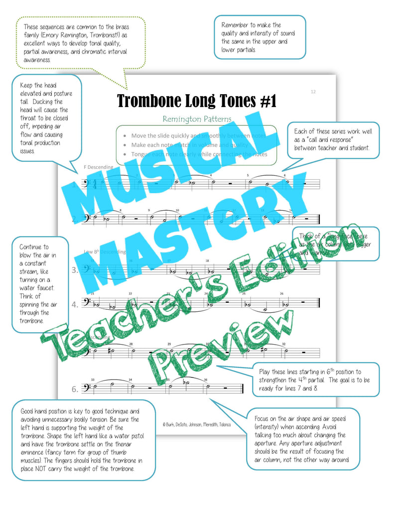 This book is set up by instrument, so you will have everything at your fingertips if you are teaching in a homogeneous setting. If you are teaching in a heterogeneous setting, you will still have everything displayed in the same order for each instrument, making it easy to locate the information that you seek. Each section will contain information on breathing, embouchure, tone production, articulation, method of use, and exercises used.
