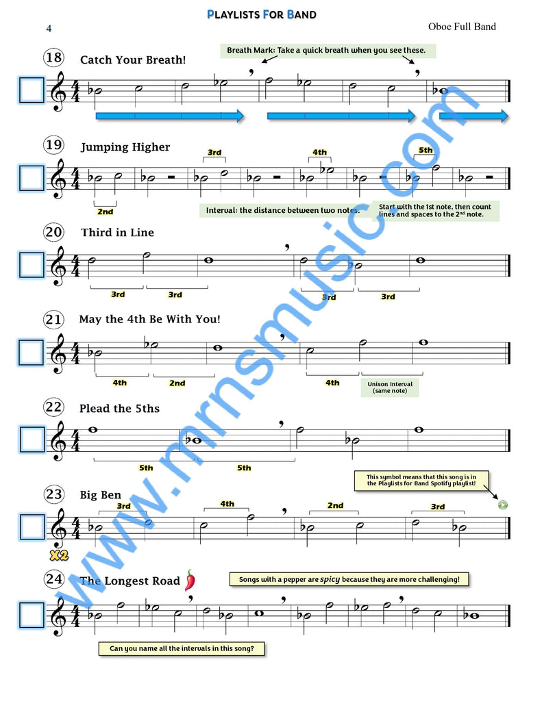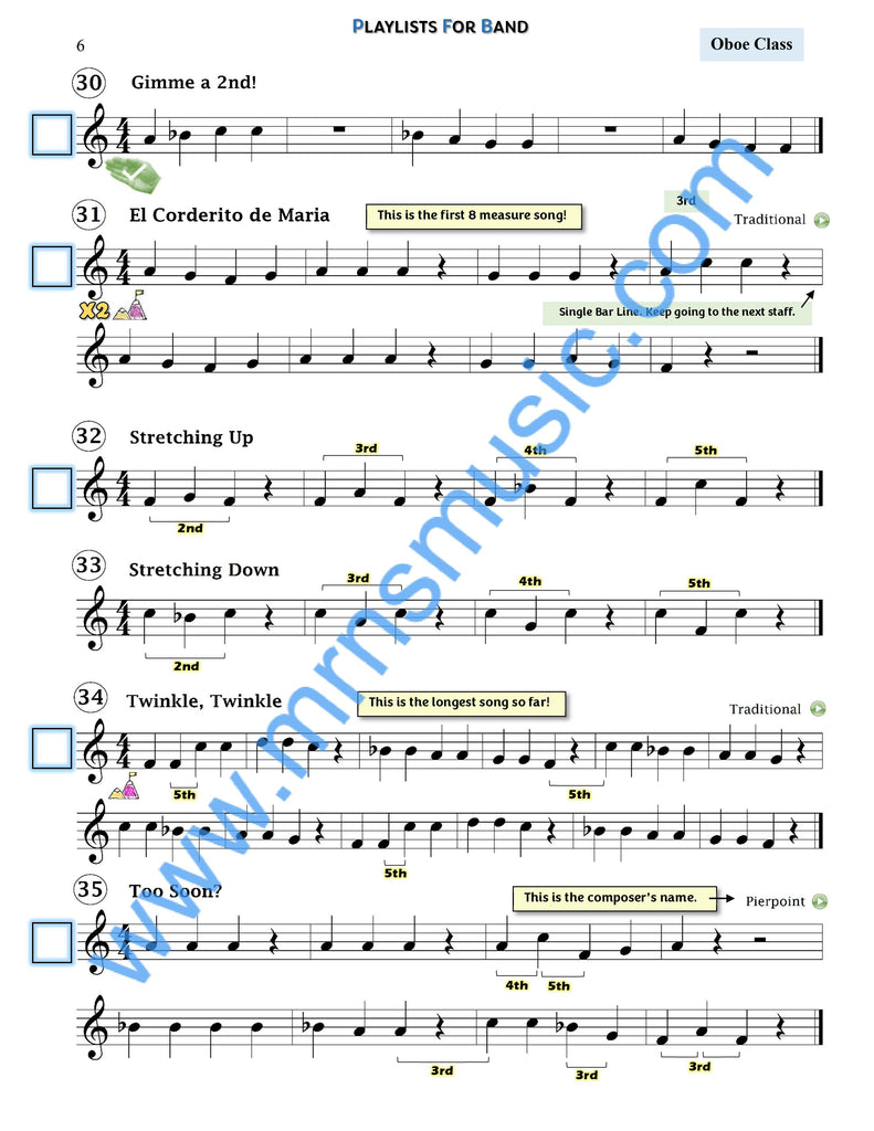 Colorful graphics are used to identify key and time signatures, intervals, definitions, challenging measures and more! Sticker boxes to mark progress, assignments, etc. are present on all 200 songs.