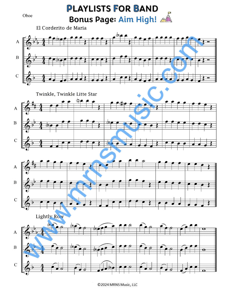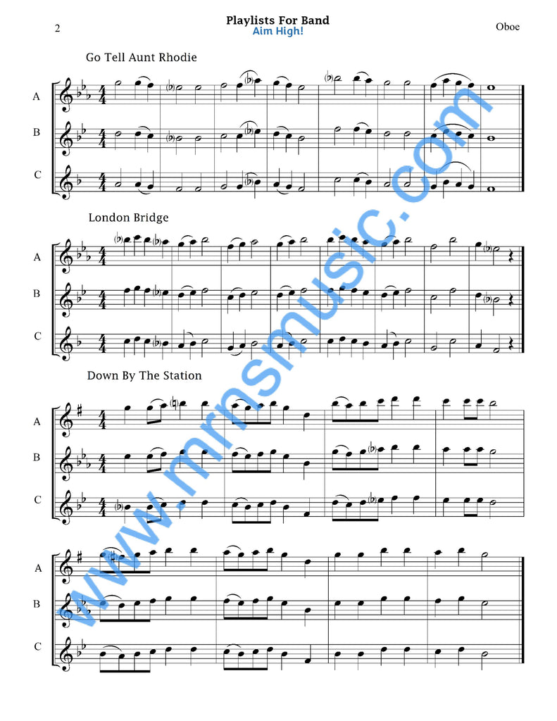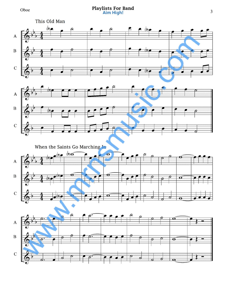 An Aim High! section provides material designed to give students extra help in preparing to read higher notes in their second year. Some instruments also have lower notes to read. These are based on easier songs from the beginning of the book.