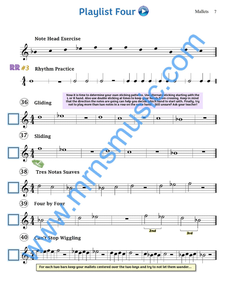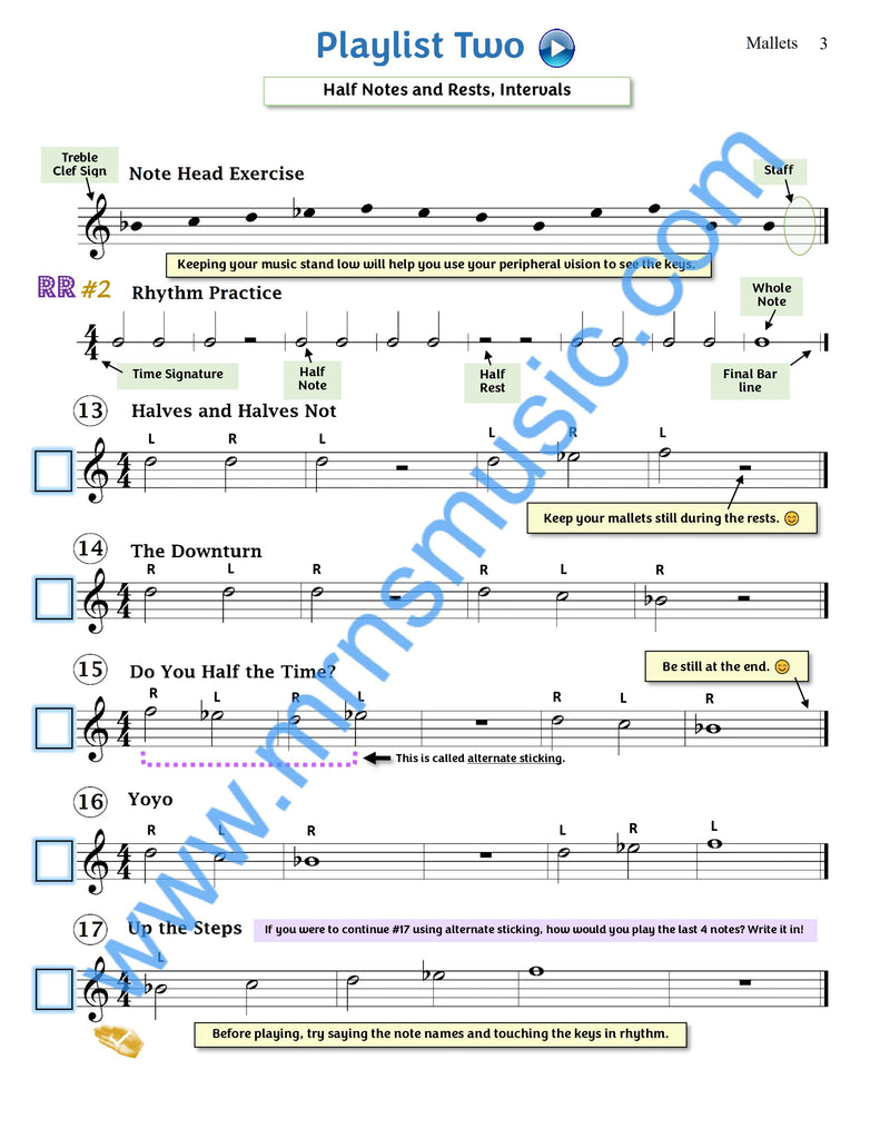 Colorful graphics are used to identify key and time signatures, intervals, definitions, challenging measures and more! Sticker boxes to mark progress, assignments, etc. are present on all 200 songs.