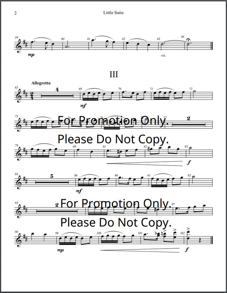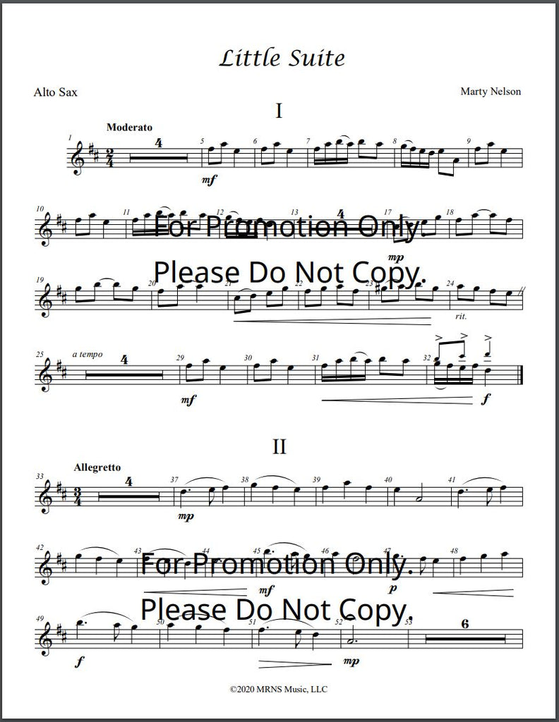 Little Suite  Solo for Alto Sax and Piano is an advanced beginner level or second year solo in three short movements.  This work is a great introduction to multi movement performance and style differences.  Little Suite seeks to develop the student's 16th articulation and finger technique.