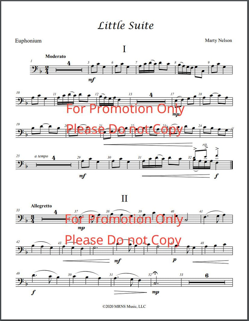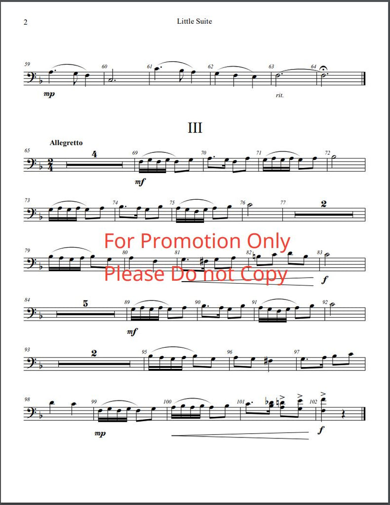 Little Suite Solo for Euphonium and Piano is an advanced beginner level or second year solo in three short movements. This work is a great introduction to multi movement performance and style differences. Little Suite seeks to develop the student's 16th articulation and finger technique.