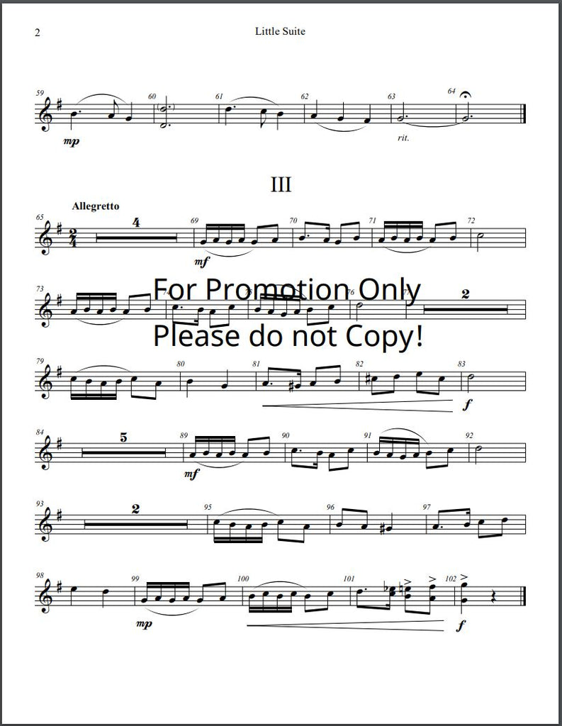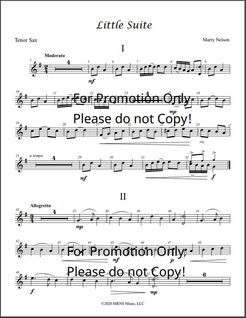 Little Suite Solo for Tenor Sax and Piano is an advanced beginner level or second year solo in three short movements.  This work is a great introduction to multi movement performance and style differences.  Little Suite seeks to develop the student's 16th articulation and finger technique.