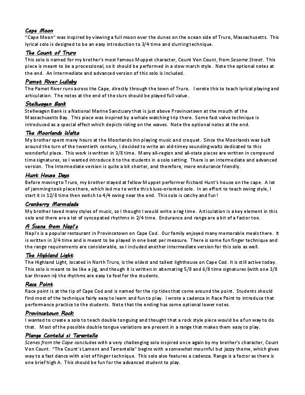 Scenes from the Cape was also born out of a desire to create a quality source of solo literature for the developing trumpeter that is both range and endurance friendly. I hope that this book will prove to be a standard resource for private instructors and band directors alike.
