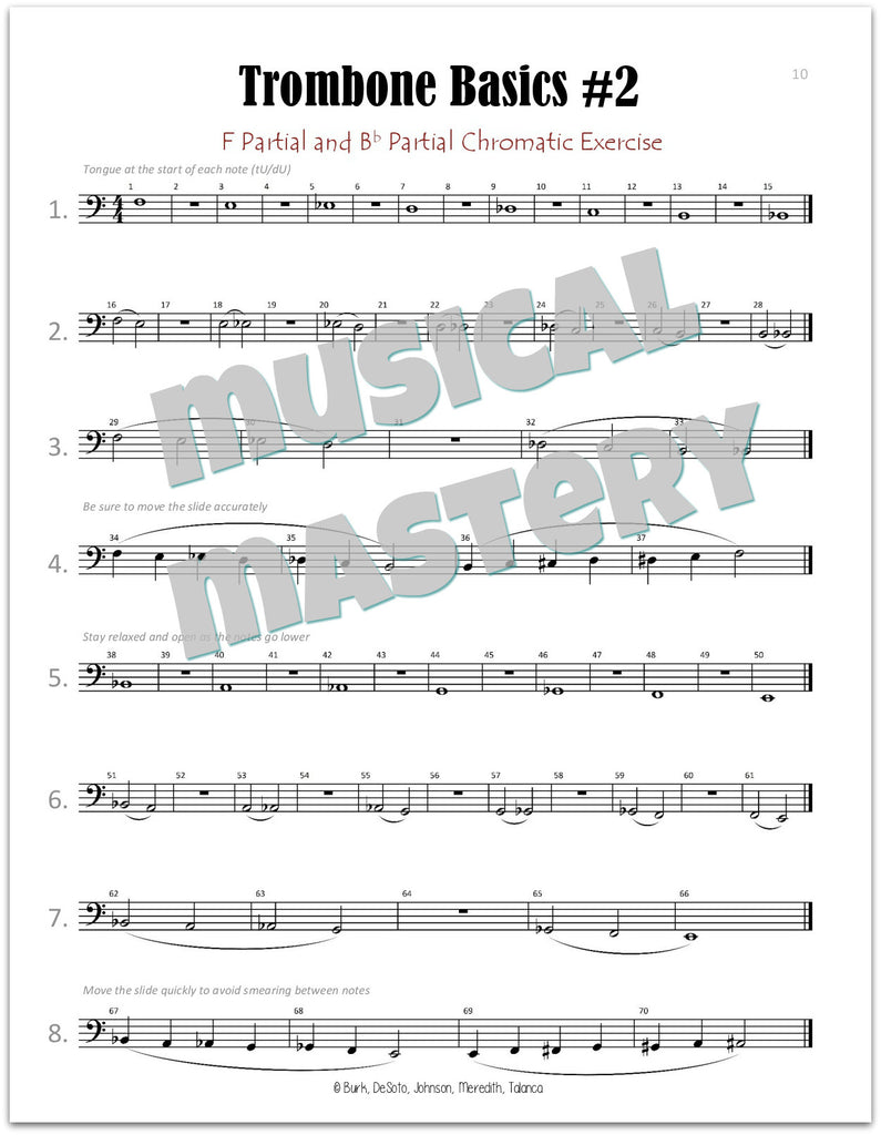 Instrument specific breathing, embouchure, tone production, articulation, instrument range, alternate fingerings, and technique are covered